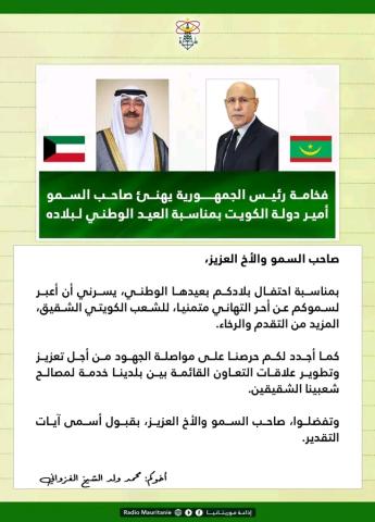 رئيسُ الجمهوريةِ يهنئُ أميرَ دولةِ الكويت بمناسبةِ العيدِ الوطني
