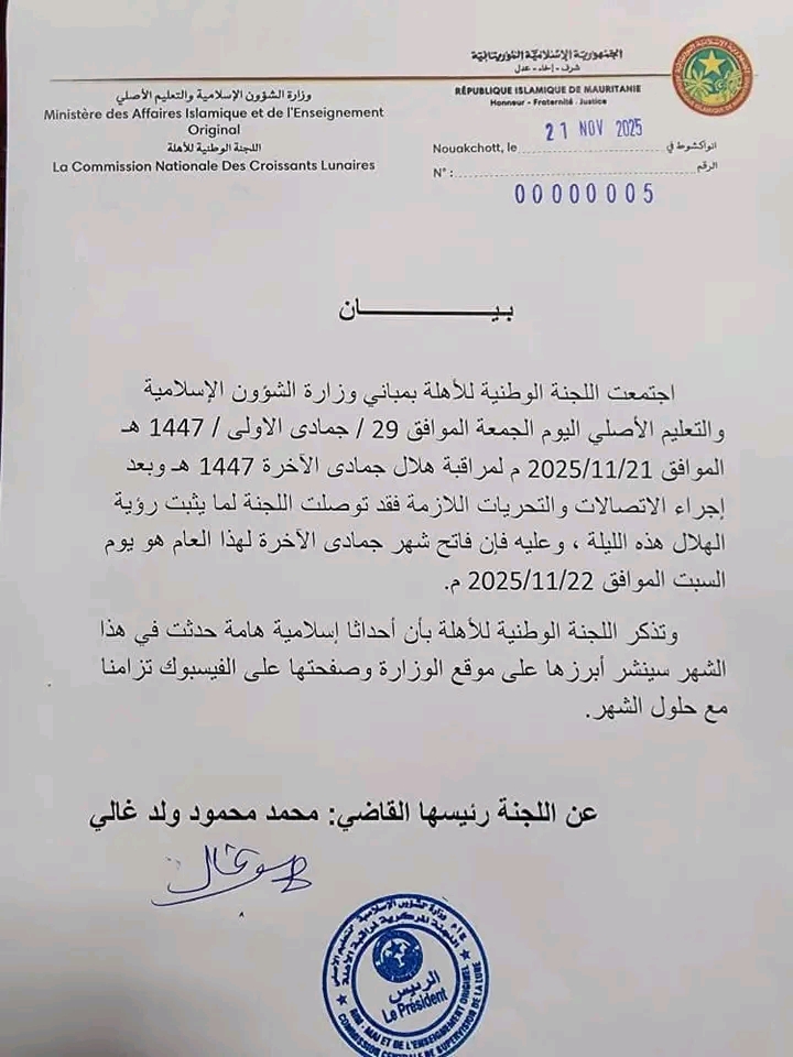 أعلنت اللجنة الوطنية للأهلة، أن غدا السبت الموافق 22 نوفمبر 2025، هو فاتح شهر جمادى الآخرة 1447 هجرية.