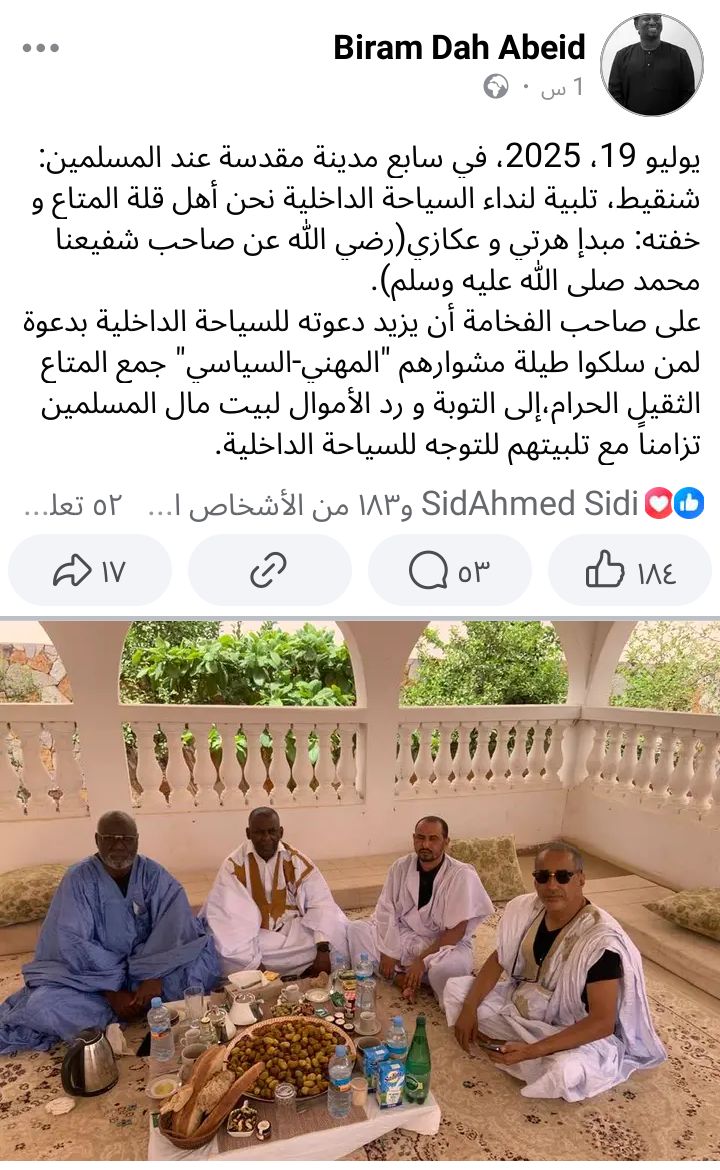 ولم يكتفِ ولد اعبيد بالحديث عن السياحة، بل أضاف دعوة جريئة موجهة إلى "صاحب الفخامة" (في إشارة إلى رئيس الجمهورية)، قائلاً: "على صاحب الفخامة أن يزيد دعوته للسياحة الداخلية بدعوة لمن سلكوا طيلة مشوارهم 'المهني-السياسي' جمع المتاع الثقيل الحرام، إلى التوبة ورد الأموال لبيت مال المسلمين تزامناً مع تلبيتهم للتوجه للسياحة الداخلية."