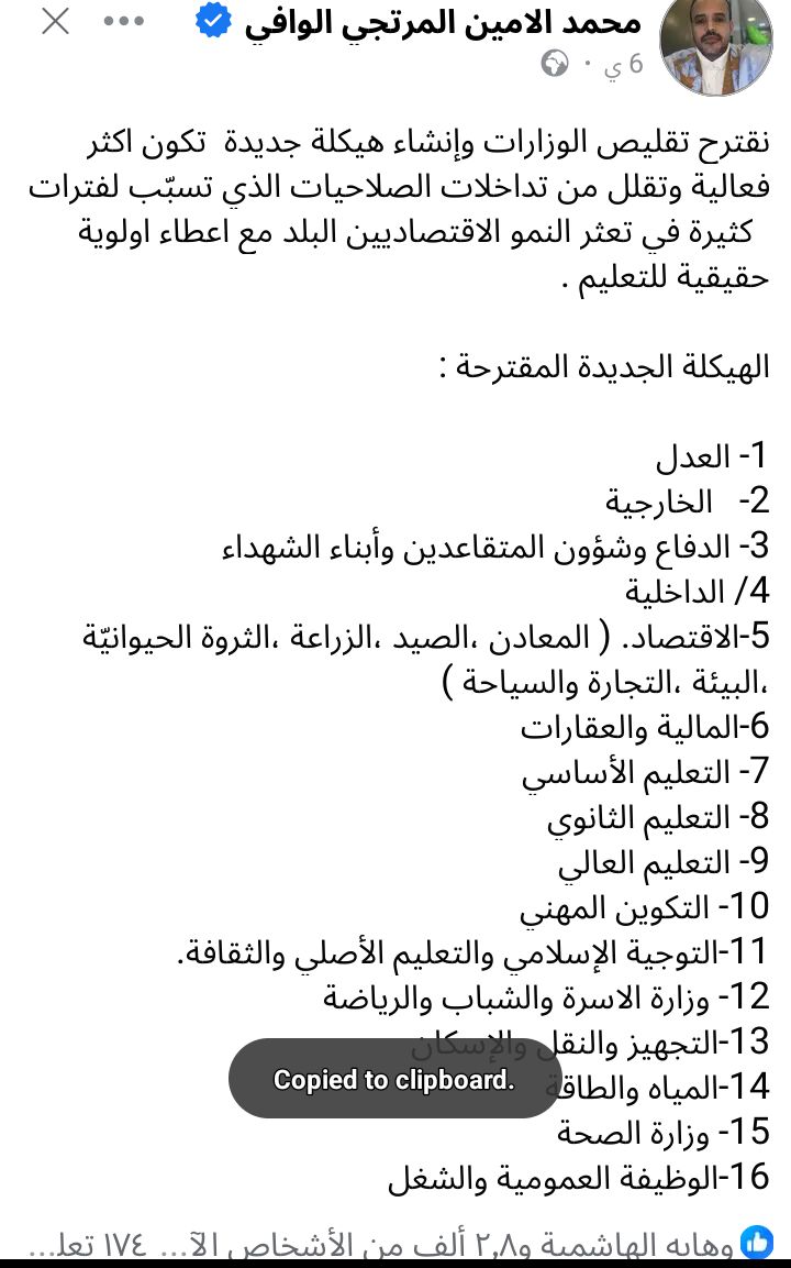 اقترح المرشح السابق للرئاسة ورئيس حزب "الخيار الآخر"، محمد الأمين المرتجي الوافي، تعديل الهيكلة الحكومية لتصبح 16 حقيبة وزارية.