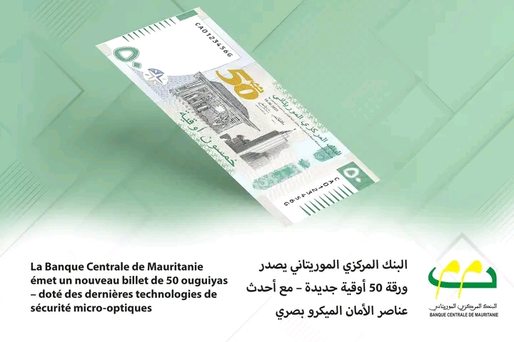 اعلن البنك المركزي الموريتاني عن إصدار نسخة جديدة ومطورة من ورقة الـ 50 أوقية، وذلك احتفالًا بمرور خمسين عامًا على الأوقية وكتتويج لجهود بحثية انطلقت في عام 2023.