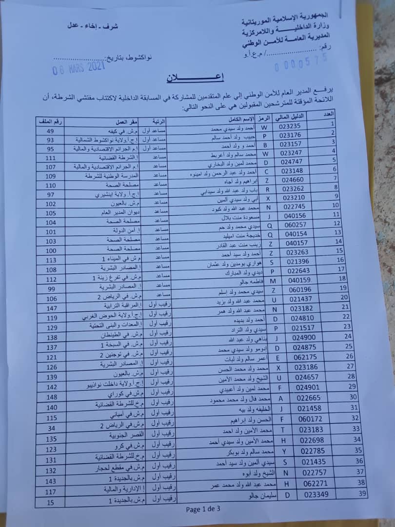 أعلنت الإدارة العامة للأمن الوطني اللائحة المؤقتة للمتقدمين للمشاركة في المسابقة الداخلية لاكتتاب مفتشي الشرطة.