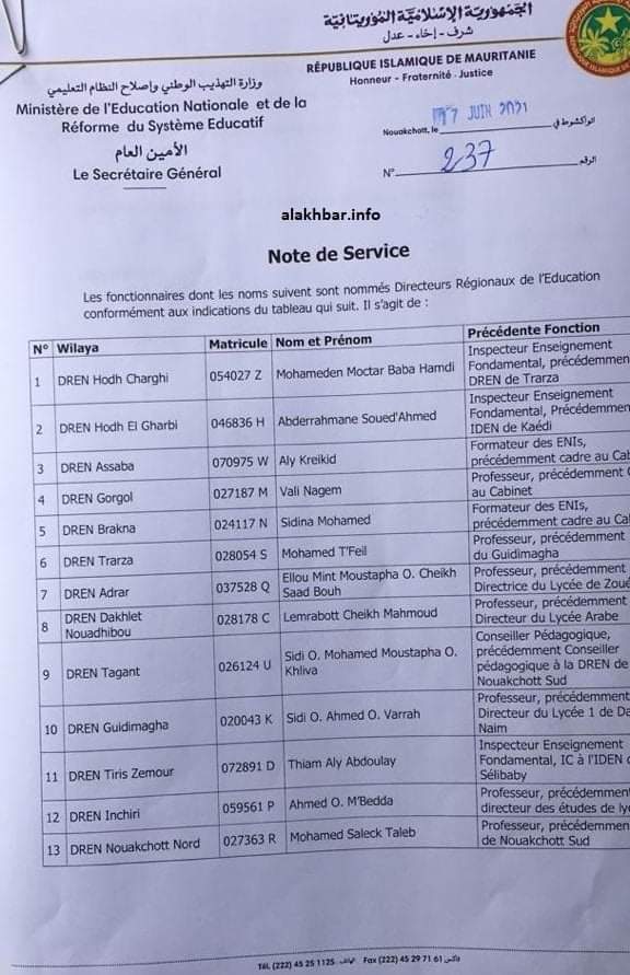 أصدرت وزارة التهذيب الوطني وإصلاح النظام التعليمي اليوم الخميس مذكرة عمل تم بموجبها تعيين مديرين جهويين للتعليم في جميع الولايات.