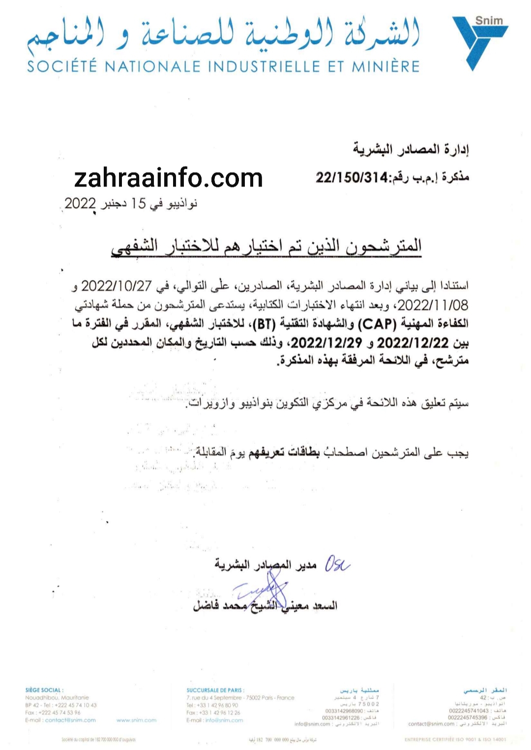 طلبت إدارة المصادر البشرية في الشركة الوطنية للصناعة والمناجم "SNIM"، من خريجي مركز التكوين التقني في ازويرات، لإتمام إجراءات اكتتابهم في الشركة.