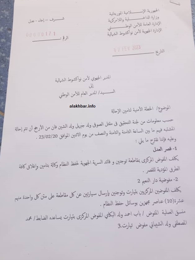 وحصلت "وكالة الأخبار" المستقلة على وثيقة أمنية صادرة عن المدير الجهوي للأمن في ولاية نواكشوط الشمالية، وموجهة للمدير العام للأمن الوطني، تتضمن مقترحا بخطة لمواكبة عملية إحالة المشتبه بهم إلى النيابة العامة.