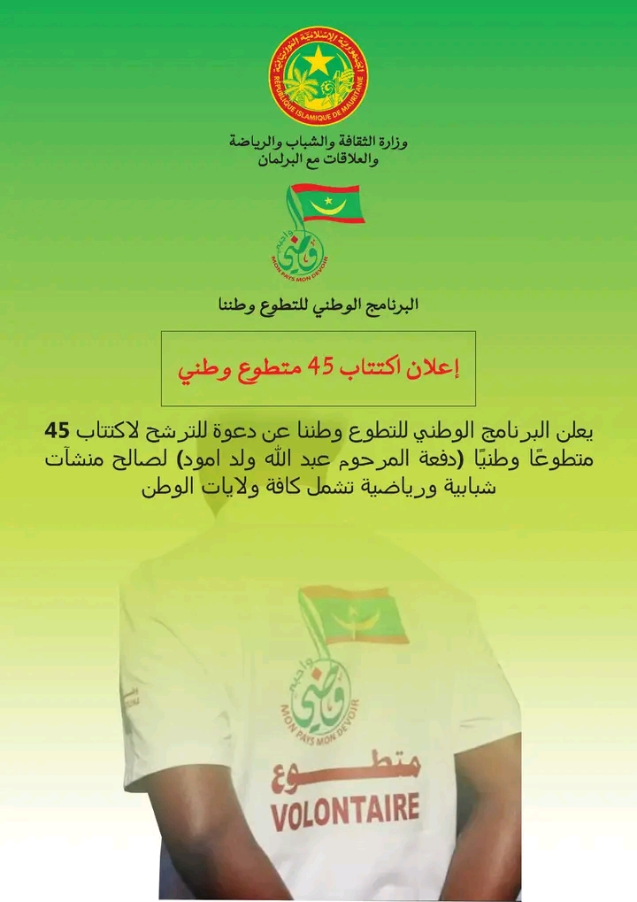 يعلن البرنامج الوطني للتطوع وطننا عن دعوة للترشح لاكتتاب 45 متطوعًا وطنيًا (دفعة المرحوم عبد الله ولد امود) لصالح منشآت شبابية ورياضية تشمل كافة ولايات الوطن #وطننا