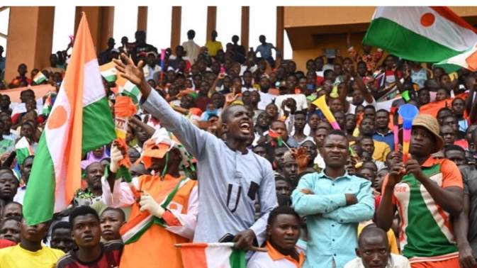 تجمع عشرات الآلاف السبت في العاصمة نيامي لدعم العسكريين ولوح مناصرو الانقلاب بأعلام النيجر والجزائر وروسيا في ملعب سيني كونتشي.