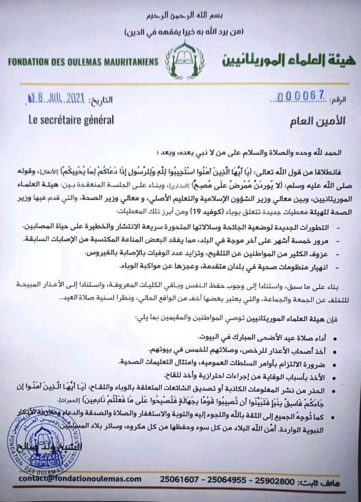 ترأس معالي الوزير الأول السيد محمد ولد بلال مسعود اليوم اجتماعا طارئا للجنة الوزارية المكلفة بمتابعة جائحة كوفيد 19، تنفيذا لتوجيهات فخامة رئيس الجمهورية السيد محمد ولد الشيخ الغزواني الهادفة إلى تعزيز التدابير الوقائية الضرورية لمواجهة تفشي هذا الوباء الخطير ، والمحافظة على صحة المواطنين.