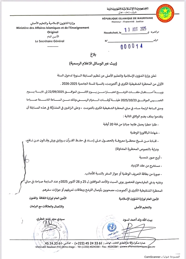 أعلنت وزارة الشؤون الإسلامية بموريتانيا صباح اليوم الإثنين عن تنظيم المسابقة السنوية لدخول السنة الأولى من المحظرة الشنقيطية الكبرى باكجوجت لسنة 2025 _ 2026.