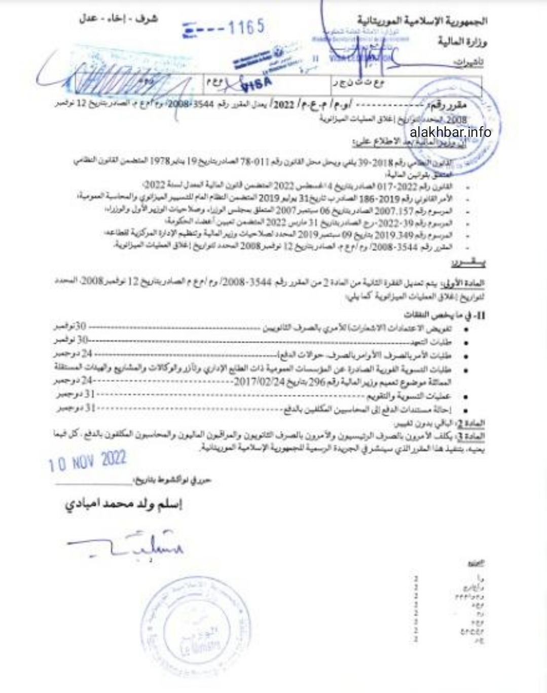 وقع وزير المالية إسلم ولد محمد امبادي مقررا أجل بموجبه موعد إغلاق الميزانية الذي كان مقررا منتصف الأسبوع القادم، حيث مدد بعضها إلى نهاية نوفمبر، وبعضها إلى نهاية العام الجاري.
