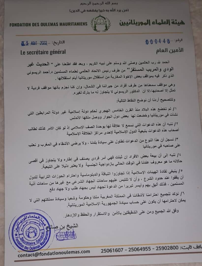 هيئة العلماء الموريتانيين وصفت في بيان لها، حديث الريسوني كذلك بـ"أنه غير ودي ومريب ومستفز".