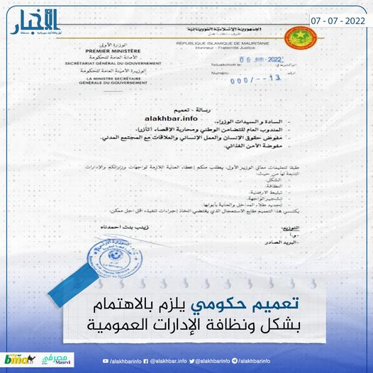 أصدرت الوزيرة الأمينة العام للحكومة زينب بنت أحمدناه تعميما باسم الوزير الأول محمد ولد بلال ألزمت بموجبه أعضاء الحكومة بإعطاء العناية اللازمة لواجهات وزاراتهم والإدارات التابعة لها.